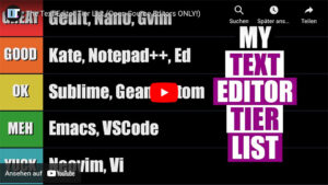 DistroTube (06.06.2022) In this video, I will give you my “tier list” for the various text editors that I have used, which includes: ► Atom ► Ed ► Emacs ► Geany ► Gedit ► Gvim ► Kakoune ► Kate ► Micro ► Nano ► Neovim ► Notepadqq ► Vi ► Vim
