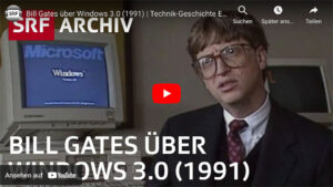 Windows 3.0 ist da, und Microsoft-Gründer Bill Gates erklärt in Zürich gleich selber, was das Betriebssystem alles kann. Vorausgesetzt man hat 3 MB Speicher! [“10vor10” vom 27. März 1991]